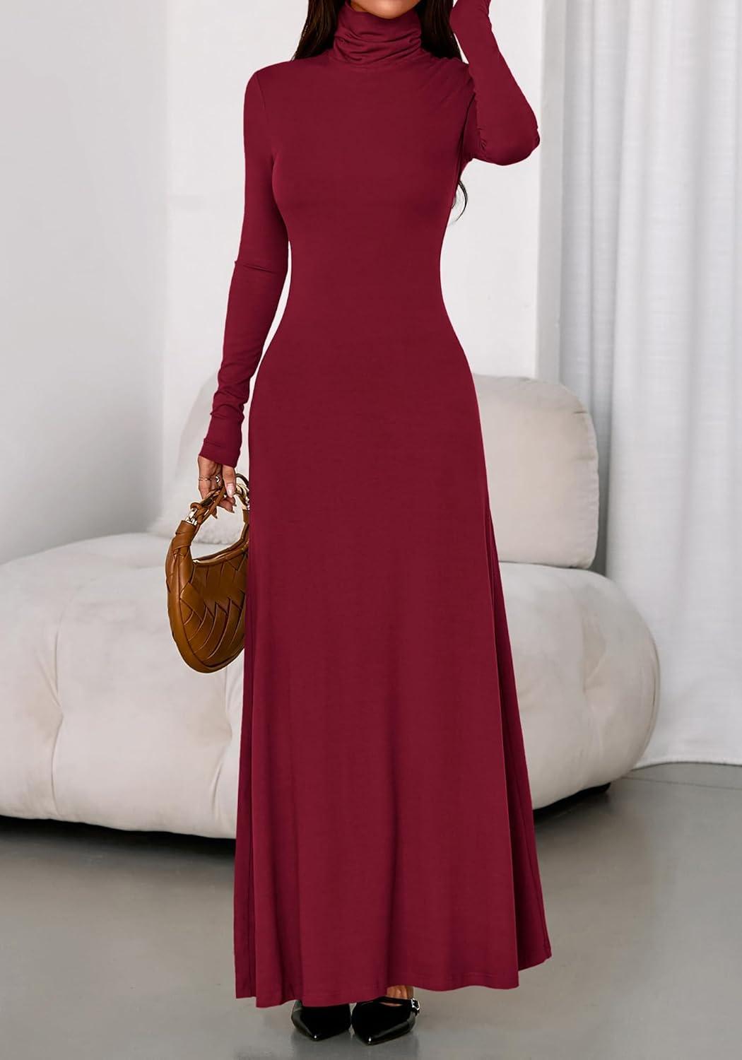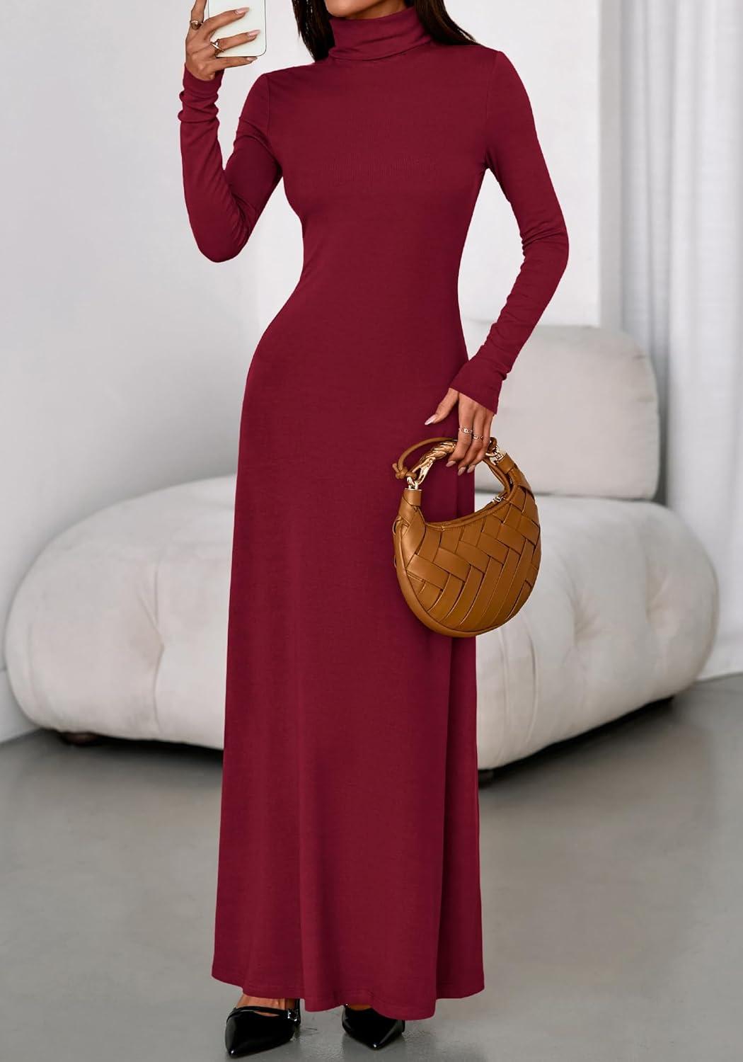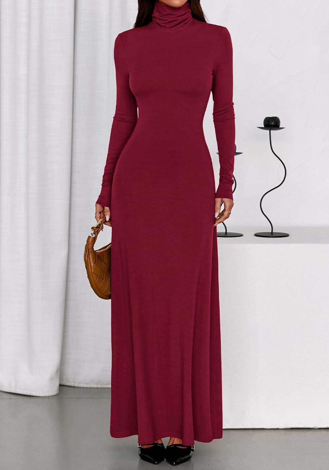 BTFBM Womens Dresses Long Sleeve Turtle Neck Stretchy Knit Long Maxi Semi Formal Party Fall Wedding Guest Dress 2025(Burgundy)