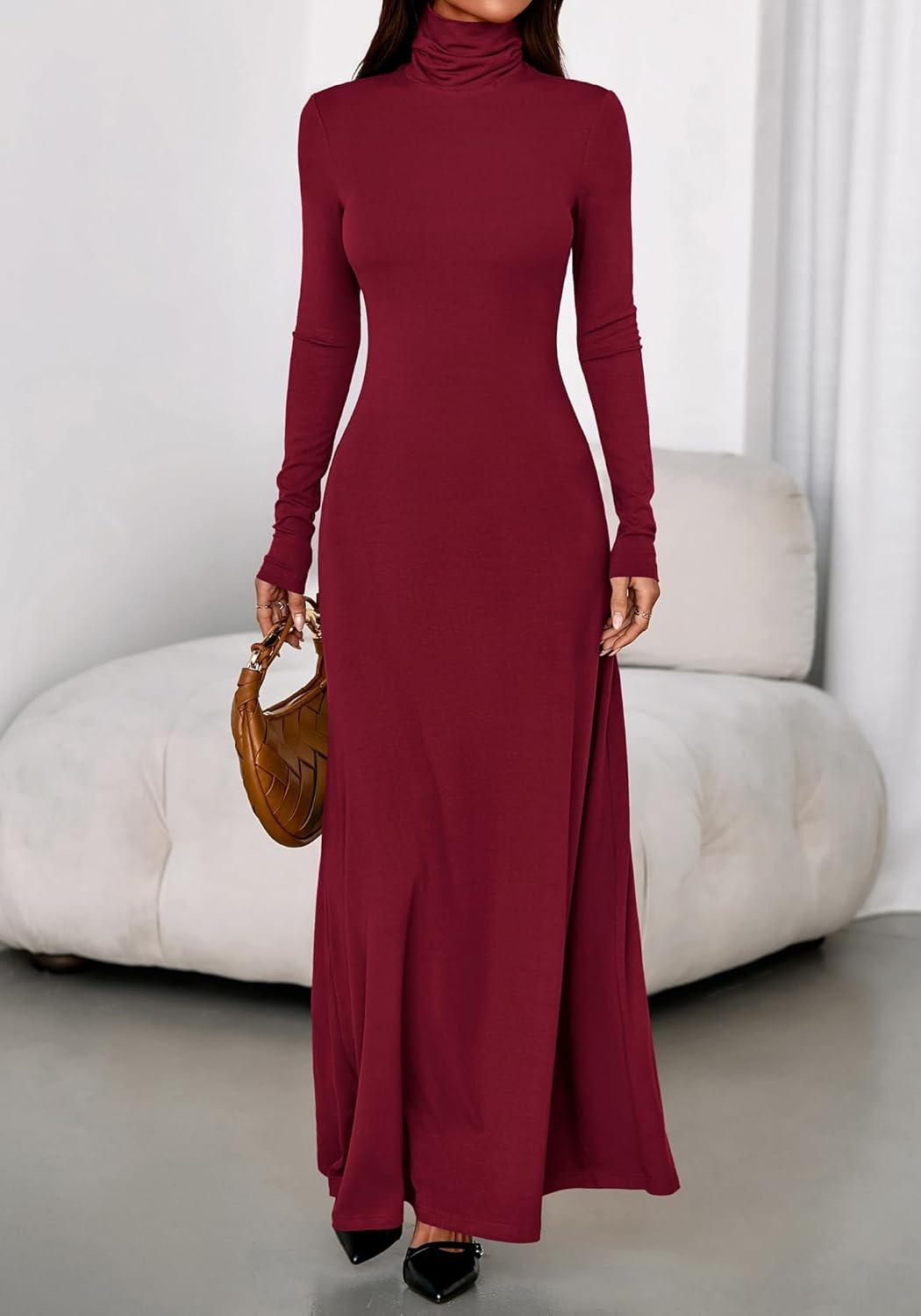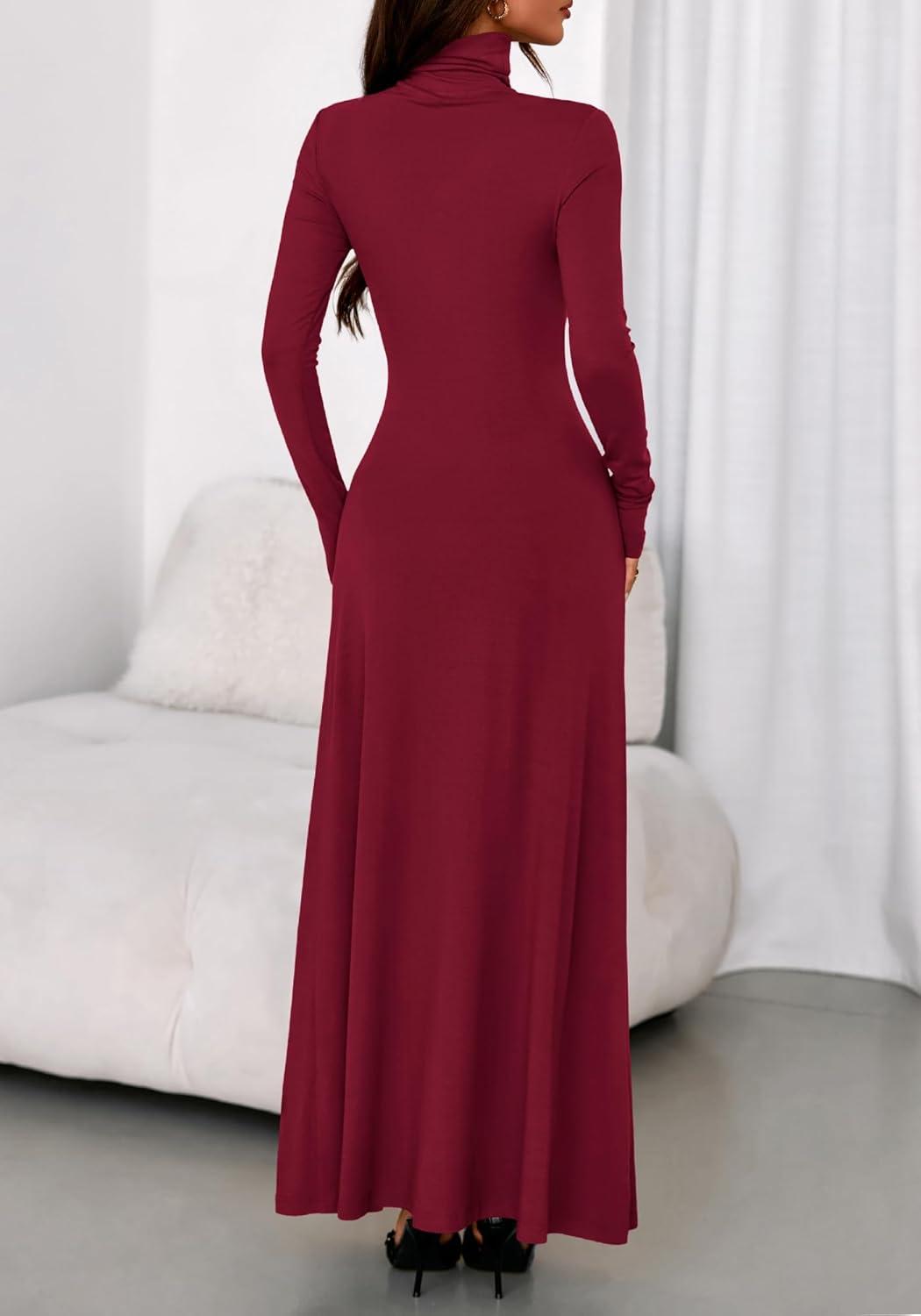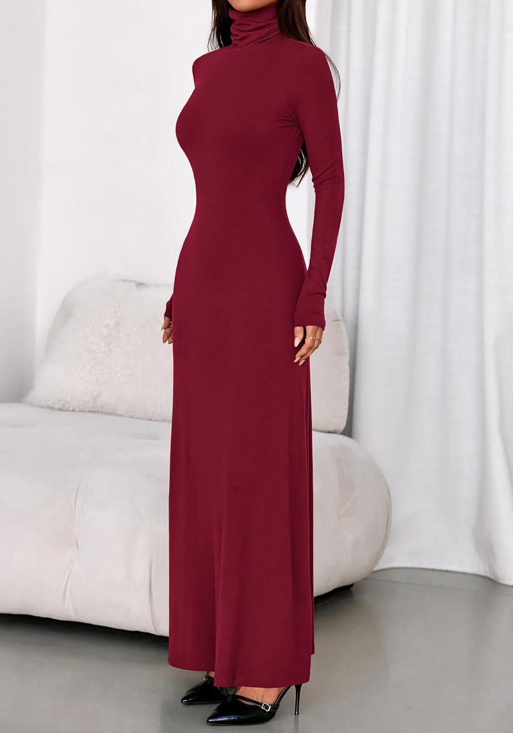 BTFBM Womens Dresses Long Sleeve Turtle Neck Stretchy Knit Long Maxi Semi Formal Party Fall Wedding Guest Dress 2025(Burgundy)
