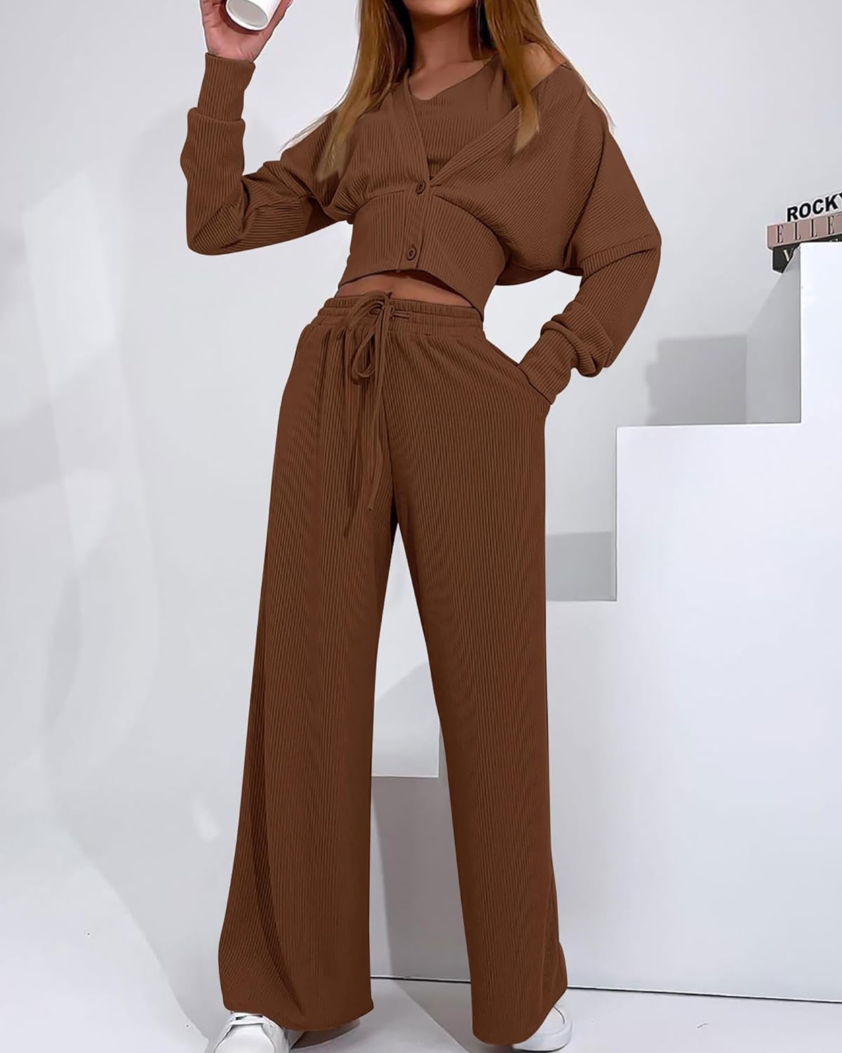 BTFBM Women's Fall 3 Piece Outfits Fashion Matching Sets Ribbed Knit Cardigan Cropped Tank Tops Wide Leg Pant Tracksuits(Solid Coffee)