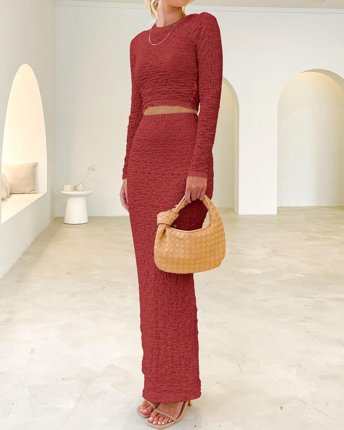 FEATURES: S=US 4-6, M=US 8-10, L=US 12-14, XL=US 16-18, XXL=US 20 / 2 Piece Fall Outfits / Maxi Skirt Sets For Women / Crew Neck / Long Sleeve Crop Top And Long Skirt Set / Ruched Bodycon / Mermaid Hem / Strech Material / Matching Outfit Set / Wedding Guest Dress Suits