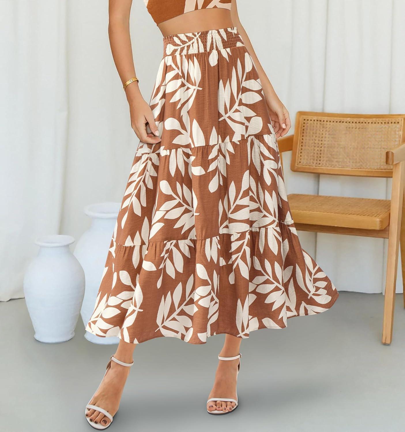 BTFBM Women’s Floral Print Midi Maxi Skirts 2025 Summer Casual Aline Elastic High Waist Pleated Flowy Long Skirt Pockets(Floral Khaki)