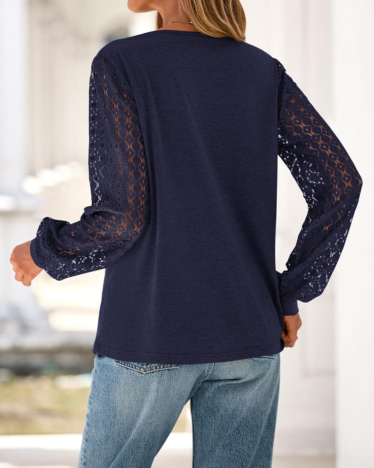 BTFBM Women’s Long Sleeve Shirts Dressy Lace Fall Tops 2025 Trendy Business Casual T-Shirts Cute Work Outfits Blouses(Navy Blue)