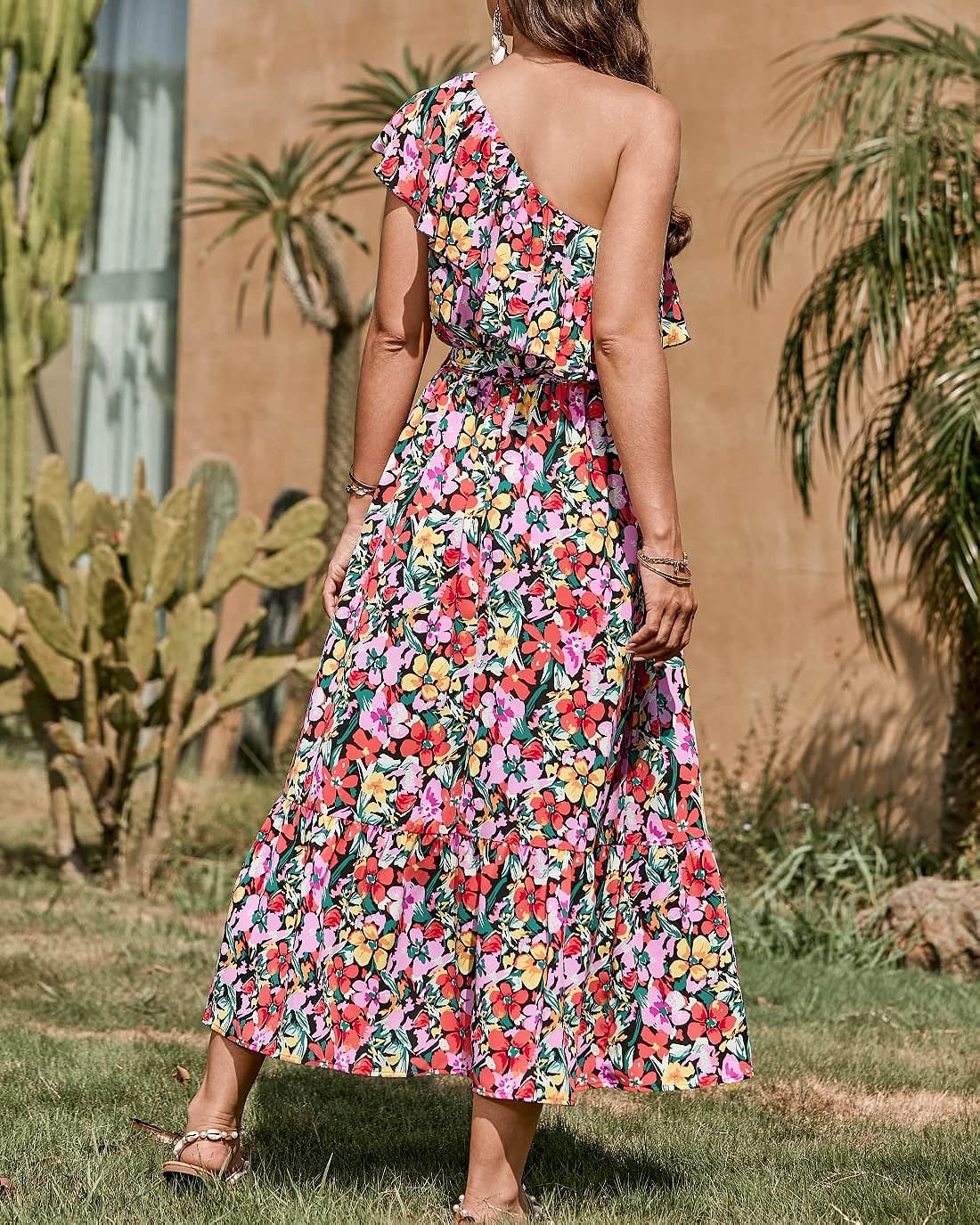FEATURES: S=US 4-6, M=US 8-10, L=US 12-14, XL=US 16-18 / Summer Dresses For Women / Sleeveless Dress / One Shoulder Dresses For Women / Boho Dress / Flowy Ruffle Trim At The Top / Elastic High Waist / Self Tie Belt / Fashion Floral Print / Flounce Pleated Hem / Flowy A-Line Shape / Soft And Lightweight / Maxi Long Dress / Sexy Dresses For Women