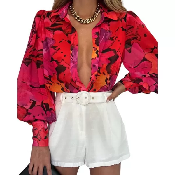 imageBTFBM Women Fashion Button Down Shirts Lapel V Neck Printed Boho Long Sleeve Blouses Dressy Casual Summer Spring TopsFloral Red