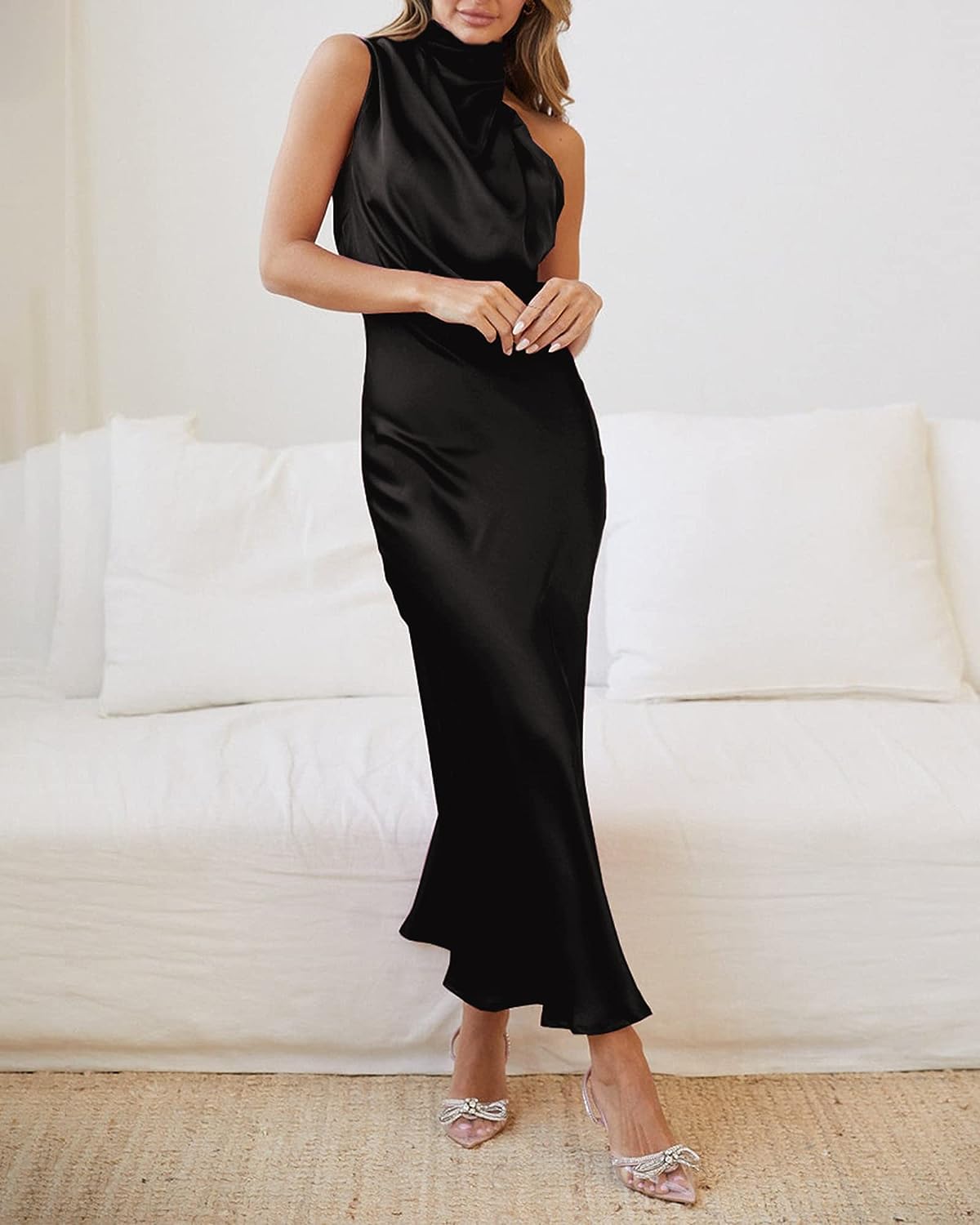 FEATURES: Size: S=US 4-6,M=US 8-10,L=US 12-14,XL=US 16-18,XXL=US 20-22 / Long Formal Dress / Satin Dress / Cocktail Dresses / Wedding Guest Dresses For Women / Sleeveless / Irregular Armholes / Mock Neck / Keyhole Buttons At Back / Elastic High Waist / Maxi Length / Evening Dresses For Women / Ball Gown For Women / Perfect For Spring, Summer, Fall