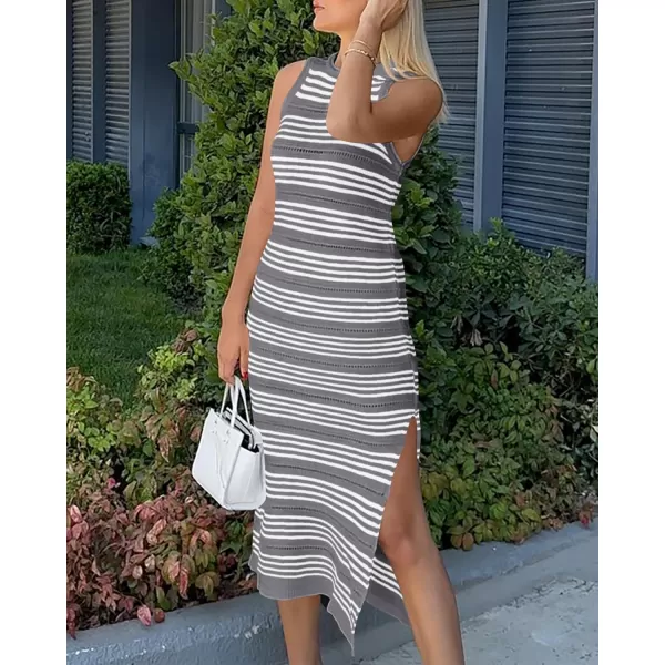 BTFBM Women's Sleeveless Summer Dresses 2024 Crew Neck Casual Sundress Hollow Out Side Slit Bodycon Knit Long Tank Dress(Striped Grey)