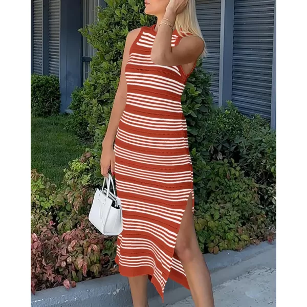 imageBTFBM Womens Sleeveless Summer Dresses 2024 Crew Neck Casual Sundress Hollow Out Side Slit Bodycon Knit Long Tank DressStriped Rust Red