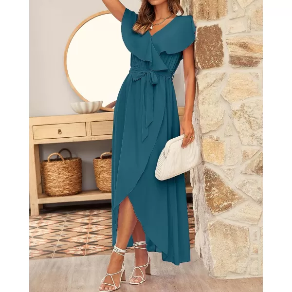 BTFBM Women’s Summer Chiffon Maxi Dresses Deep V Neck Ruffle Short Sleeve Beach Party Cocktail Flowy Wrap Dress with Belt(Solid Dark Blue)