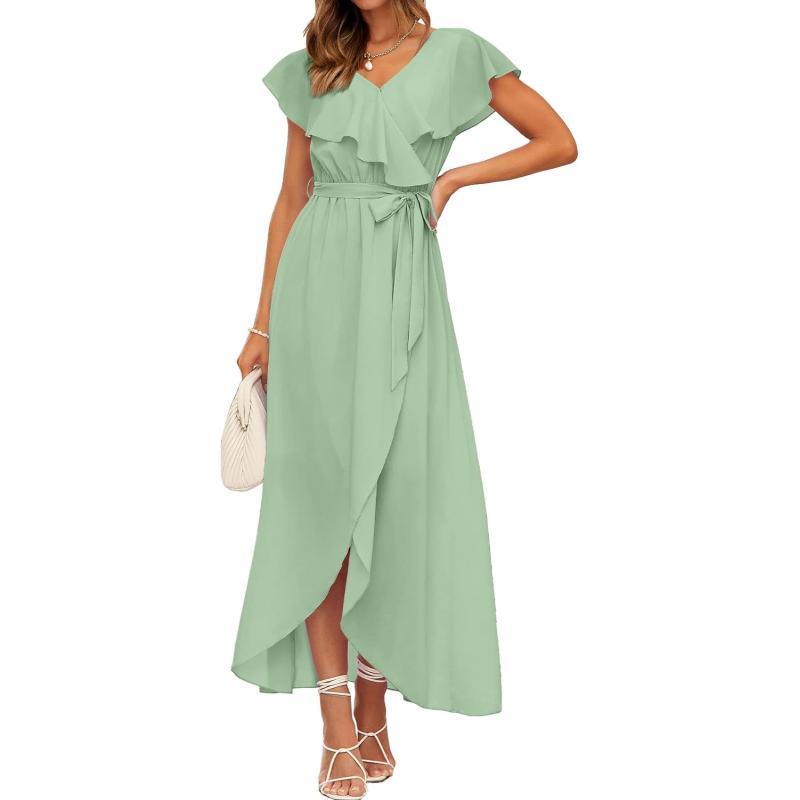 FEATURES: Summer Dresses For Women 2023 / Wedding Guest Dresses For Women / Maxi Dress For Women / Ruffle Wrap Dress / Deep V Neck With Safety Snap / Ruffle Layer / Elastic Empire Waist With Belt / With Lining / Slit Hem / Classic Solid Color / Chiffon Material / Long Summer Dresses For Women / Casual Dress