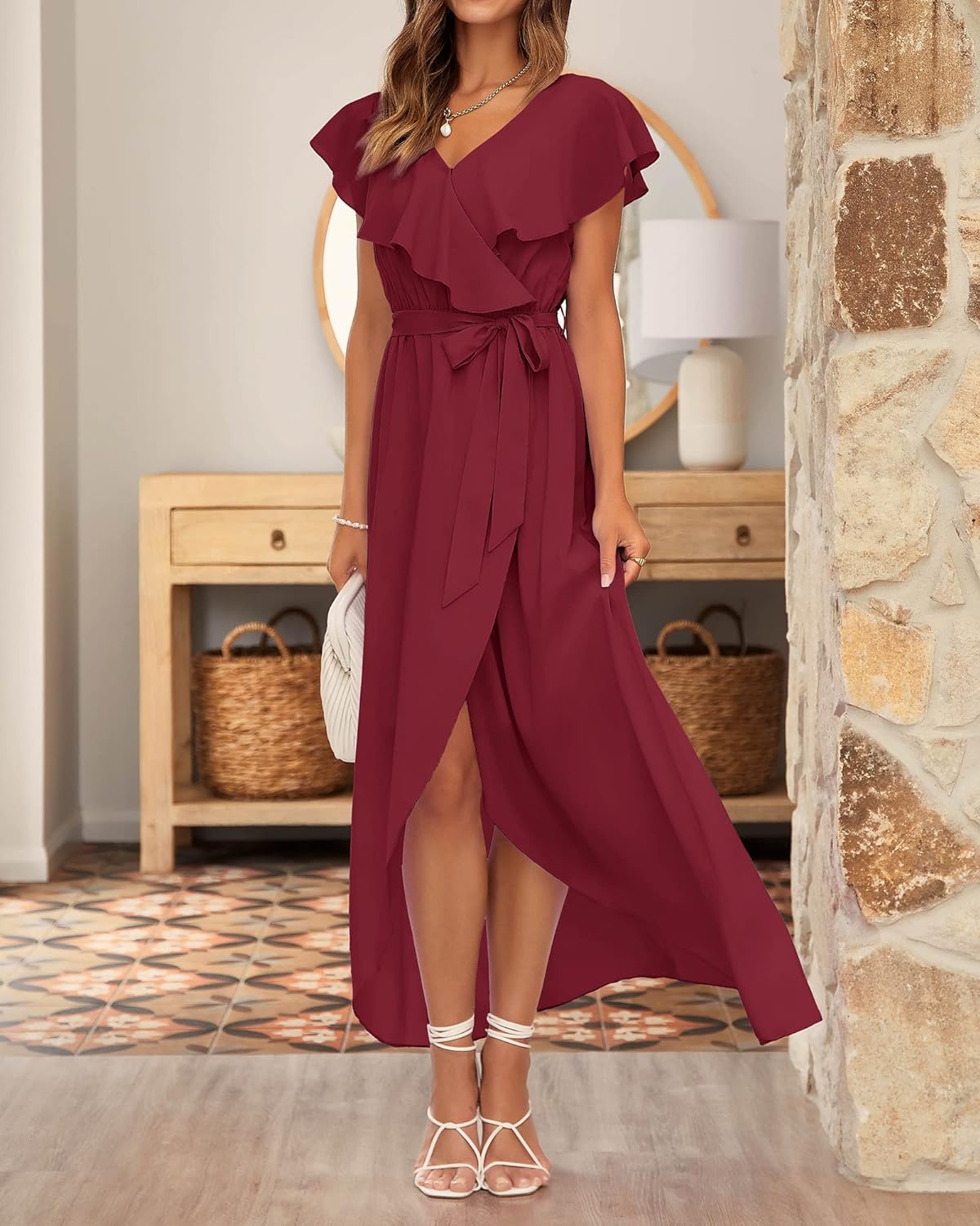 FEATURES: Summer Dresses For Women 2023 / Wedding Guest Dresses For Women / Maxi Dress For Women / Ruffle Wrap Dress / Deep V Neck With Safety Snap / Ruffle Layer / Elastic Empire Waist With Belt / With Lining / Slit Hem / Classic Solid Color / Chiffon Material / Long Summer Dresses For Women / Casual Dress