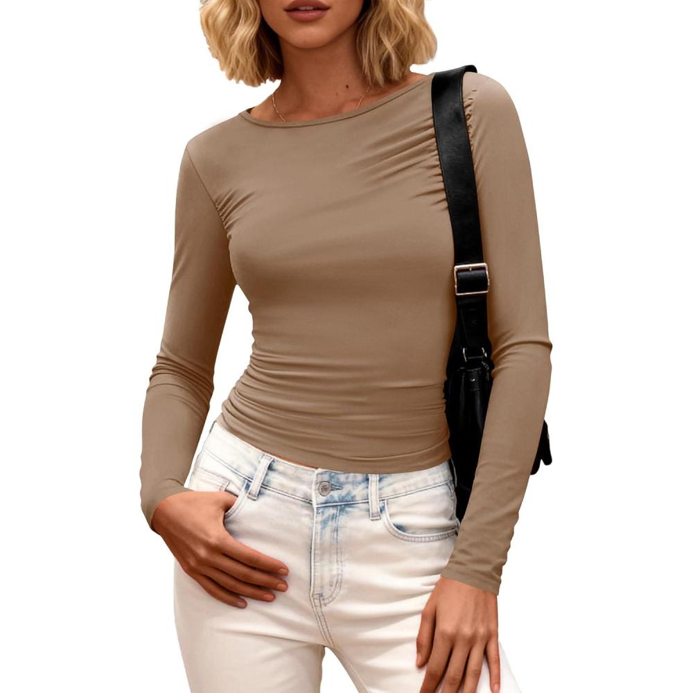 BTFBM Womens Tops 2025 Fall Clothes Long Sleeve T Shirts Boat Neck Ruched Slim Fit Casual Stretchy Going Out Outfits(Khaki)