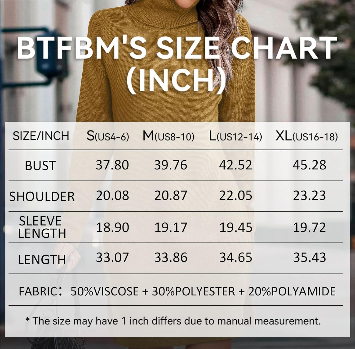 Women Sweater Features: Size: S=US 4-6,M=US 8-10,L=US 12-14,XL=US 16-18 / Womens Sweaters / Fall Sweaters For Women / Sweater Dress For Women / Pullover Sweater / Women Turtleneck Sweater / Long Sleeve / Dropped Shoulders / Ribbed Cuffs And Hemline / Baggy Fit /Above Knee Length / Side Slit Hem / Solid Color / Knitwear Casual Style / Super Flattering And Chic