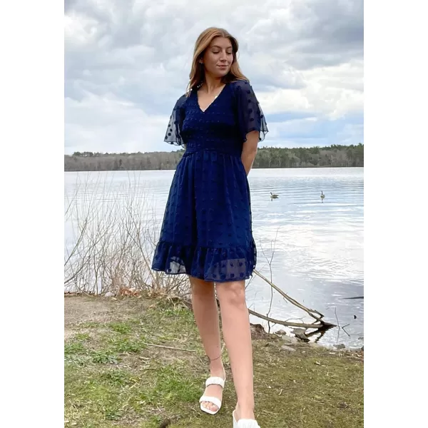 BTFBM Women’s V Neck Smocked Short Sleeve Casual Dress Swiss Dot Swing Flowy Ruffle Hem Mini Beach Summer Dresses 2023(Swiss Dot Navy)