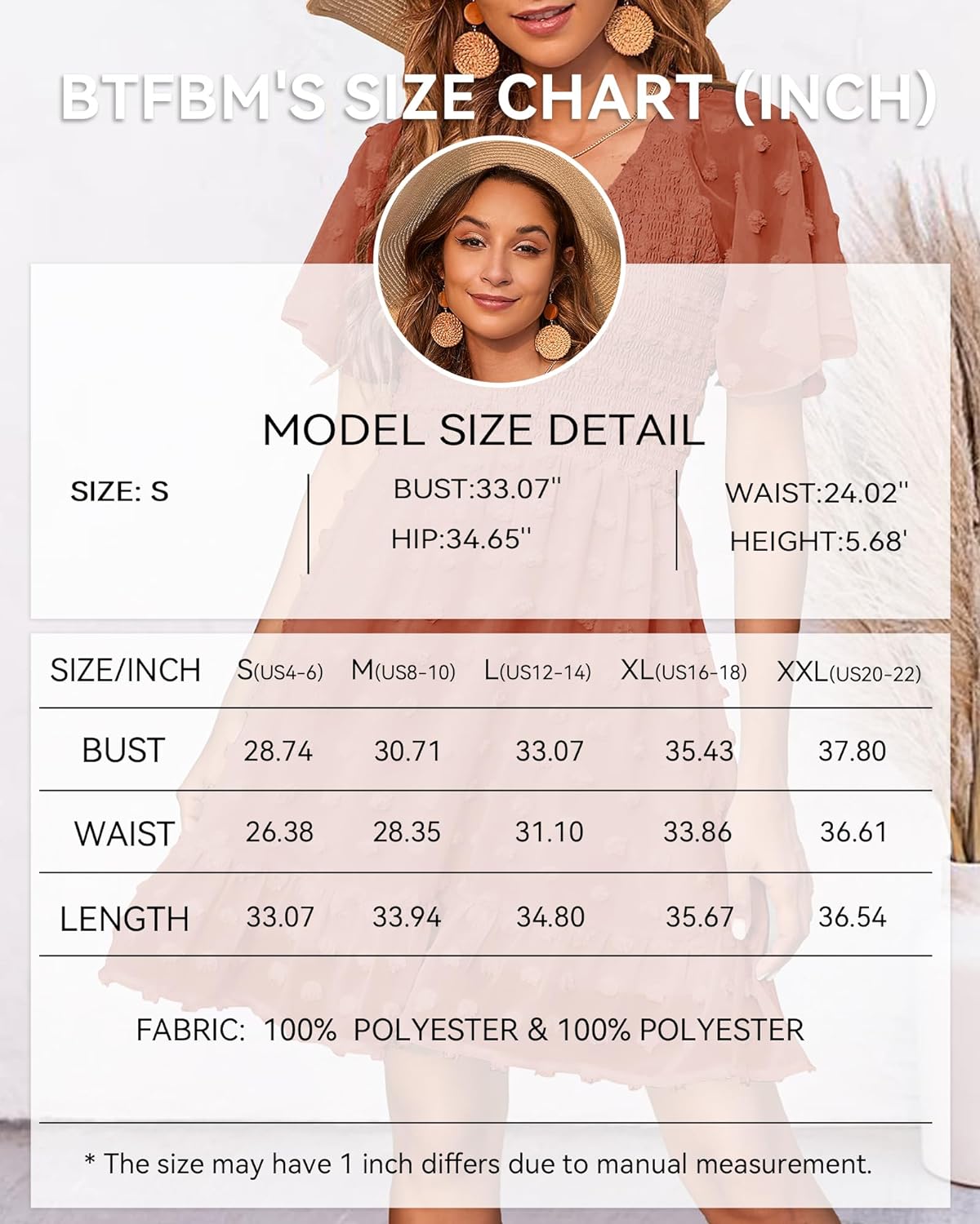 imageBTFBM Womens V Neck Smocked Short Sleeve Casual Dress Swiss Dot Swing Flowy Ruffle Hem Mini Beach Summer Dresses 2023Swiss Dot Orange